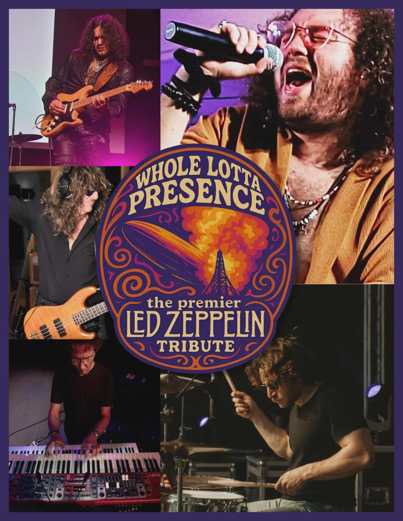 Whole Lotta Presence is a premier Led Zeppelin tribute band delivering the power, precision, and energy of a live Zeppelin concert. They perform all of the iconic songs like “Stairway to Heaven,” “Kashmir,” “Black Dog,” Daze and Confused” and so many more with a power and accuracy that makes you feel like you are at a real Led Zeppelin concert. From soaring vocals and authentic guitar work to dynamic stage presence and full-band intensity, Whole Lotta Presence recreates the legendary sound of Led Zeppelin for modern audiences. Full live band — no backing tracks, just pure performance